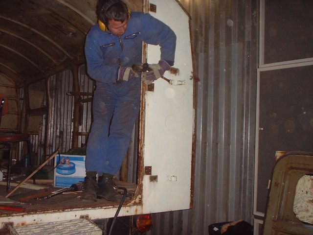 Versuche haben gezeigt, dass es am Schnellsten geht, wenn man die Fläche der Beplankung mit der Flex rausschneidet und die Ränder danach abbaut. Das geht mit ein paar strategischen Schnitten, dem Hammer und Karrosseriemeissel recht flott und man erspart es sich, hunderte winziger Schweisspunkte aufzubohren. Ausserdem kann man dann die unversehrten grossen Blechteile noch zum Anfertigen kleinerer Reparaturbleche verwenden