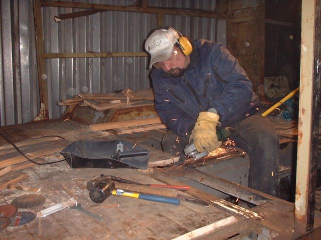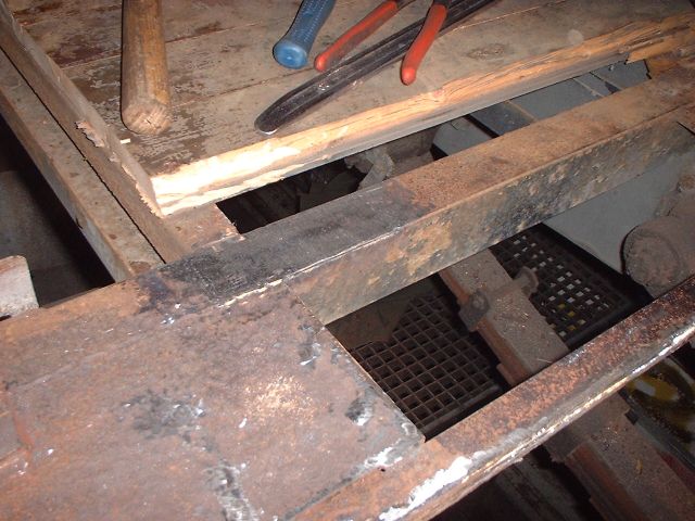 Dankenswerterweise habe ich von Freund Harry einen grossen Winkelschleifer (230mm-Scheibe) leihen können, der doch manche Blechreduktion erleichtert. Das Teil verlangte zwar erst nach einer Repapratur, aber danach waren die Bolzen, die zum kranen gedacht waren, kein Gegener mehr.