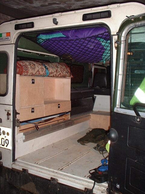 Reisen und so: der WoMo Ausbau des Landy besteht im Wesentlichen aus zwei Aluprofilen, die innen an die Radkästen geschraubt sind, auf denen Holzbretter aufliegen, die die 190cm lange Liegefläche bilden. Das langt mir gerade so, grössere Personen dürfetn ein Problem haben. Unter der Liegefläche befindet sich dadurch ein langer, flacher Stauraum.